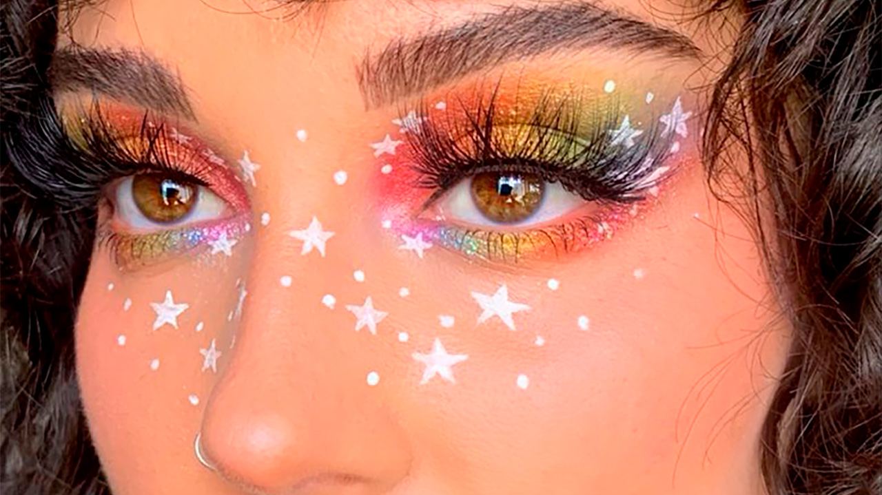 Você pode usar sombras coloridas para criar olhos em degradê de arco-íris, delineadores de tons alternativos (como azul, rosa, verde neon) e até pigmentos soltos com brilho para intensificar o efeito luminoso.