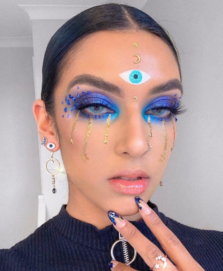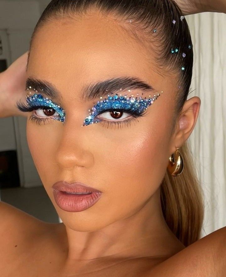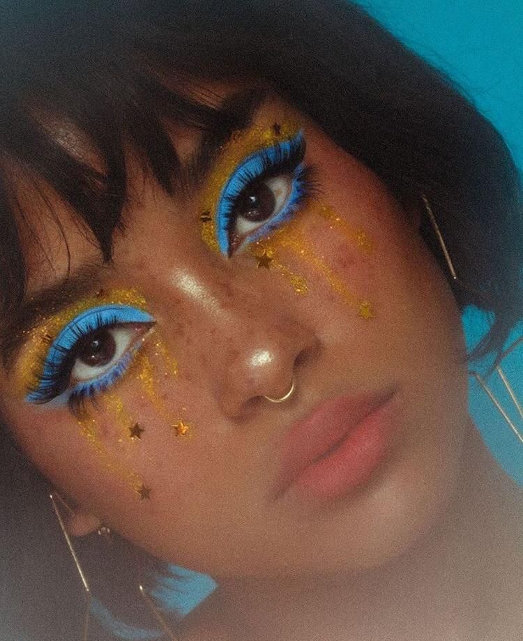 Aqui, a proposta é apostar na sombra azul ou em um delineado azul, uma das tendências de maquiagem para 2026, e complementar o visual com traços de glitter que simulam lágrimas.