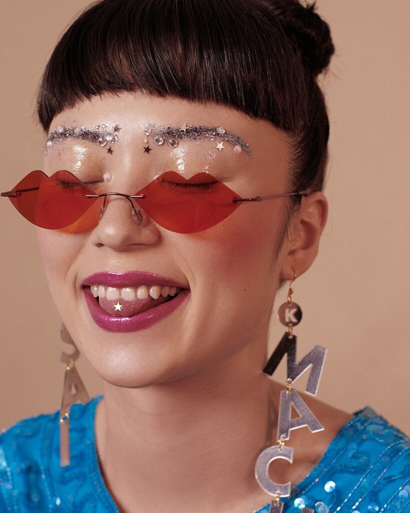 A proposta aqui é criar um delineado gráfico que percorre toda a pálpebra e se estende até as sobrancelhas e têmporas, trazendo um visual impactante e moderno. Para facilitar o processo, comece desenhando o traço escolhido com um lápis de olho próximo ao tom da sua pele. Em seguida, aplique cola de cílios sobre o desenho e vá depositando o glitter escolhido por cima – pode usar um cotonete com um pouco de cola de cílios para ir “pegando” o glitter.