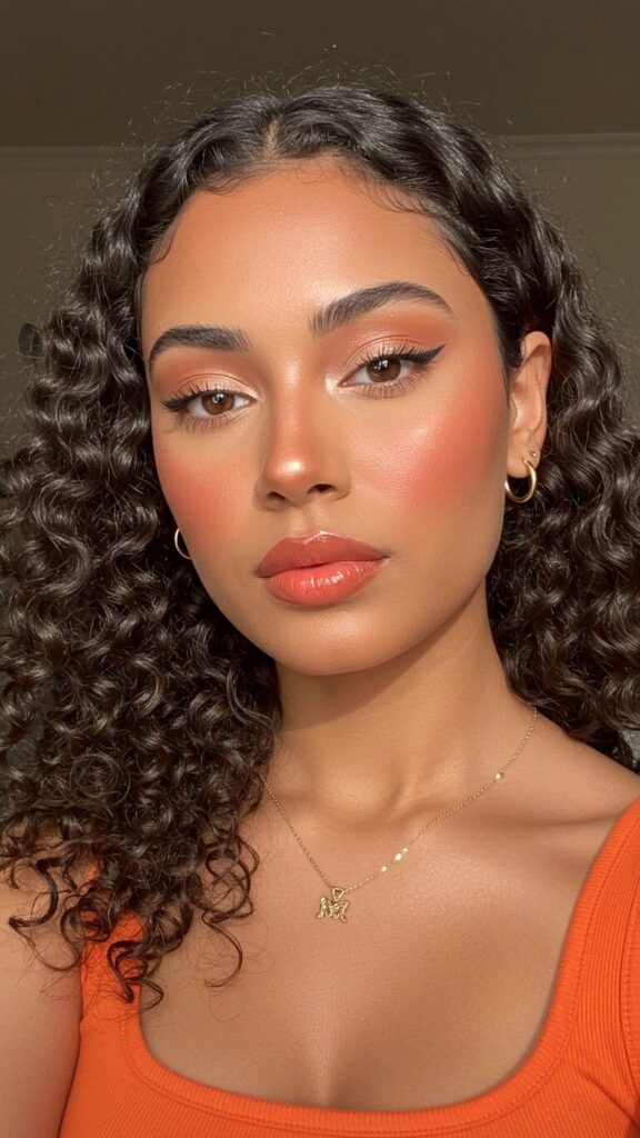 A proposta traz uma paleta em tons de coral, pêssego e rosa, sempre com acabamento leve, viçoso e natural — aquele mood de pele nada, muito blush e boca glossy.